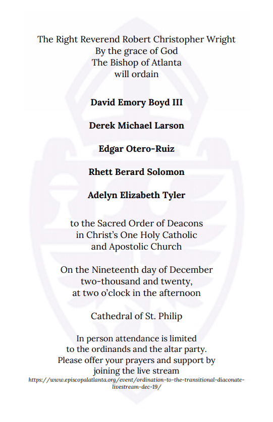 Hace casi 10 años que comencé a escuchar un llamado a ser sacerdote episcopal. Desde entonces he estado orando, discerniendo, estudiando y preparándome y ahora, el 19 de diciembre de 2020 a las 2:00 pm hora del Este, voy a ser ordenado al diaconado de transición en la Catedral de San Felipe en Atlanta. Después de trabajar unos meses como diácono, si Dios quiere y la gente consiente, voy a ordenado sacerdote después de graduarme del seminario en mayo.Se publicará una invitación formal, pero puede unirse al servicio en línea aquí: https://www.episcopalatlanta.org/event/ordination-to-the-transitional-diaconate-livestream-dec-19/.