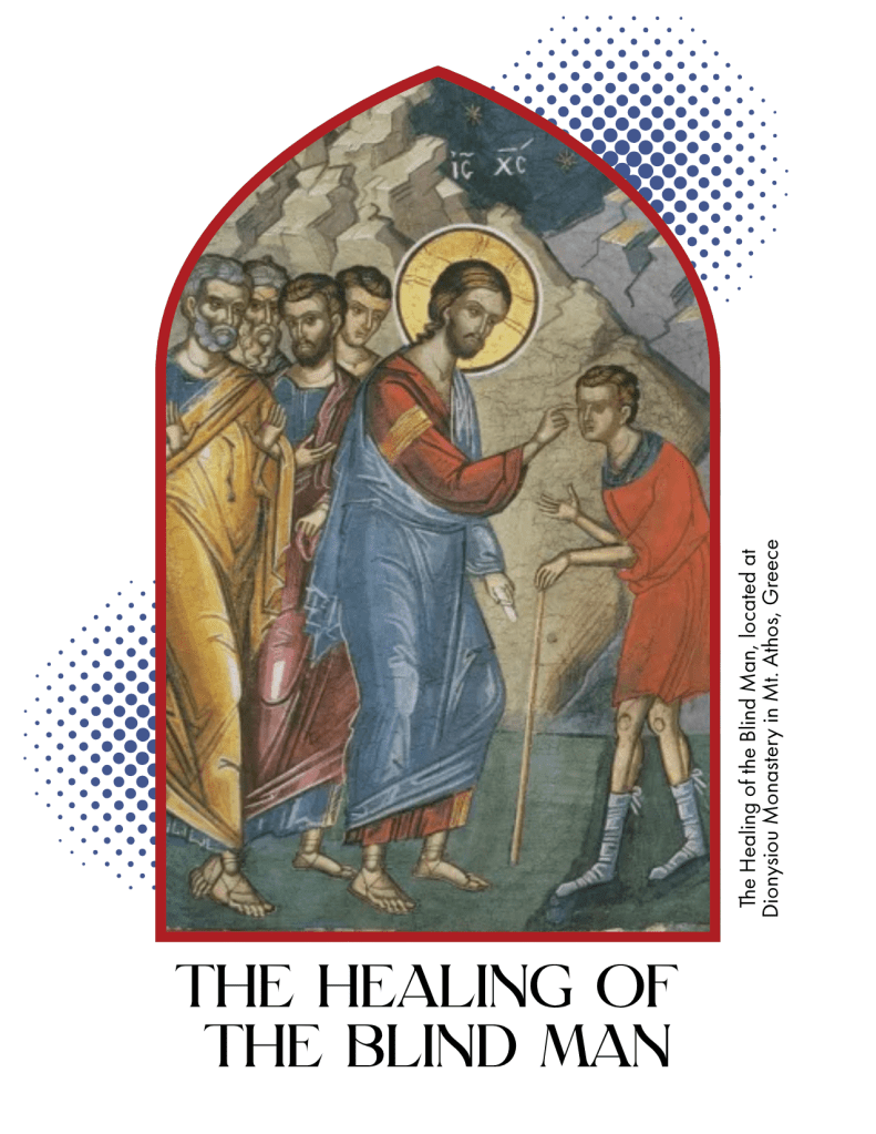 Visio Divina. It means Sacred Seeing in Latin, and is all about allowing art to lead us into prayer. So this morning I’d like to try out this practice together, and for our subject I’ve chosen a 16th century depiction of our gospel reading today: The Healing of the Blind Man, located at Dionysiou Monastery in Mt. Athos, Greece, a large monastic community in the Eastern Orthodox tradition. You’ll find the image on the prayer card in your service program. Let’s see how the practice of Visio Divina can draw us deeper into this story and the heart of God.