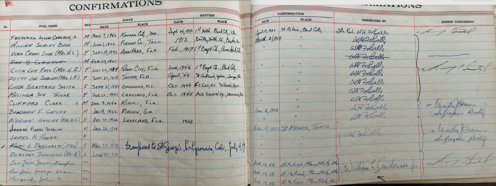 I didn’t grow up in a tradition like that, and years ago when I was trying to attain a record of my baptism, I called the church where I had grown up and been a member and was baptized, and they had no record, no memory, no knowledge of my time there or my baptism. They had not written it down. By contrast, I got a call last year by one of our online parishioners, Melinda. Melinda worships with us faithfully each week from her home in Tennessee, and she shared with me that she had been confirmed here in 1954 before she moved away. So I pulled out our parish register and flipped back to 1954, and sure enough I found her name right there, written in the hand writing of Father Folwell, on the same page as as Benjamin and Marion Gatliff who were confirmed on January 2, 1955 and William and Vera Bush, confirmed on March 21, 1954. And I was able to send a photo of that page to Melinda, which she loved. We remember in our tradition. The people and names of this community matter.